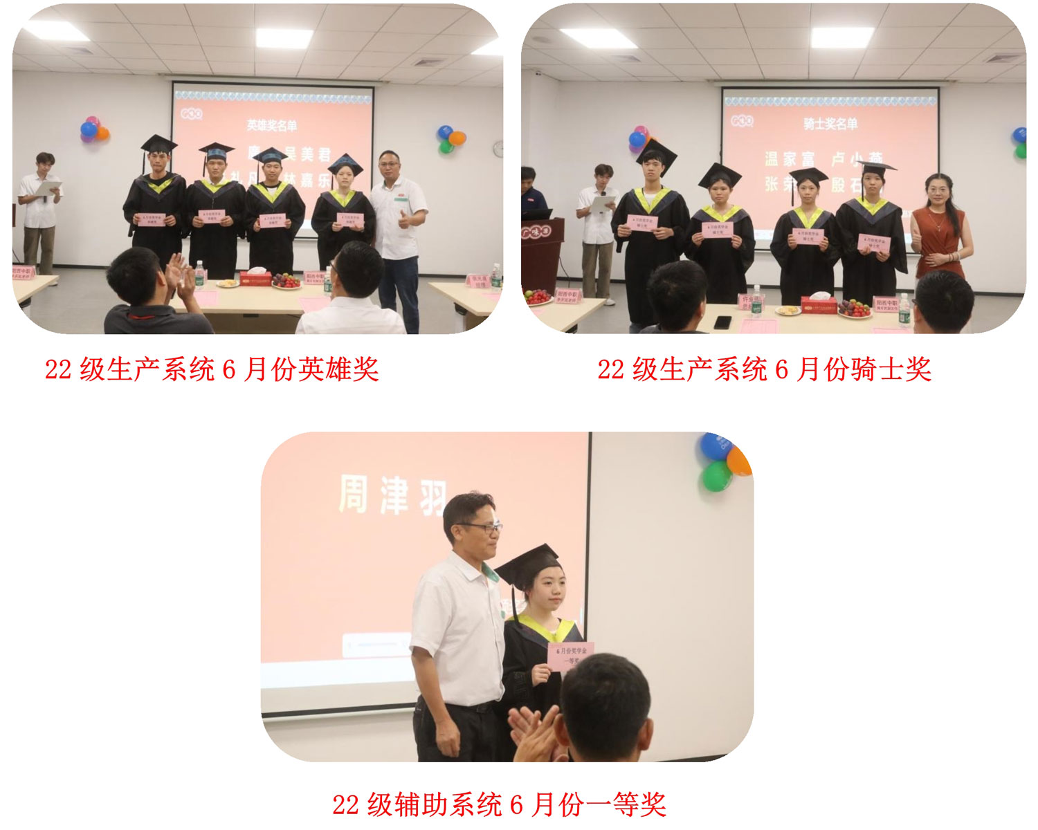 畢業(yè)典禮前廣味源生產(chǎn)部張光良經(jīng)理、行政部施華經(jīng)理、企管部劉衛(wèi)生經(jīng)理為畢業(yè)生頒發(fā)了2022級畢業(yè)生實習(xí)階段最后一個月的獎學(xué)金,為同學(xué)們的頂崗實習(xí)劃上圓滿句號。